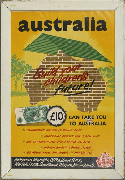 While researching materials about the Assisted Passage Migration Scheme which began in 1945 - an Australian government program to encourage British citizens to emigrate to Australia - I came across a copy of the poster above. To my modern sensibility, the wording Unoccupied White Australia and Fill up thy frontiers, man the gate, before too late is shocking. But although that poster was clearly from an earlier time, its sentiments are not so far removed from other more modern 20th century posters that refer to an empty land full of opportunity for British people to populate and thrive. I don’t know how my parents learned of the Assisted Passage Migration Scheme - perhaps it was something like the poster below that caught their attention.