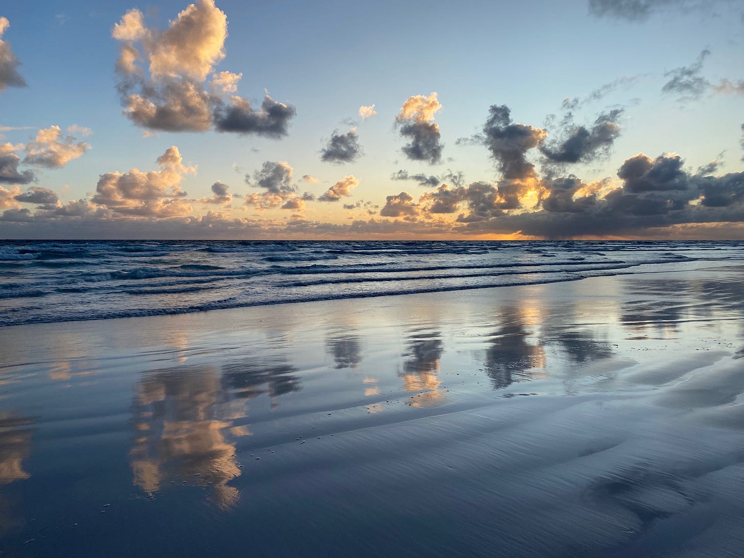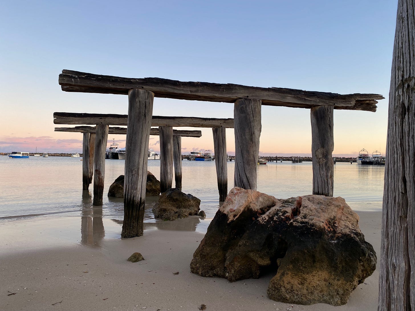 During part of my recent journey to visit family and friends in Western Australia, I enjoyed once again the miles-long white sand beaches, the magnificent Indian Ocean, the big sky vistas - vital components of my childhood years. I joined a family holiday at Port Denison, a small fishing, lobstering and tourist town 40 miles south of Geraldton, my childhood “hometown”. Mornings of clear blue skies were followed by dramatic cloud formations pierced by brilliant rainbows, which usually cleared again to treat us to stunning sunsets - the low sky and remaining clouds tinted in gold, orange, scarlet, purple, green - the colors reflected upon the sea.